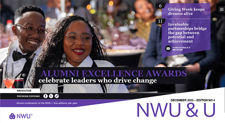 Welcome to our alumni magazine, the NWU&U. This is the 'key' to unlock the NWU world where innovation and academic excellence go hand in hand. In this magazine, you can also read about your alma mater's engagement in the surrounding communities and the inspiring achievements of your fellow alumni.