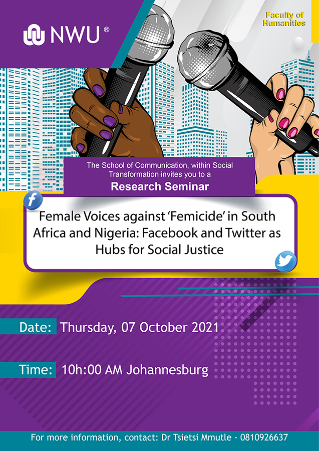 Date Thursday, October 7, 2021 Time 10:00 - 11:00 Venue Online via Zoom Description Join Zoom Meeting here Meeting ID: 993 0558 6912 Passcode: Seminar@21 Contact Details For more information, contact: Dr Tsietsi Mmutle - 0810926637