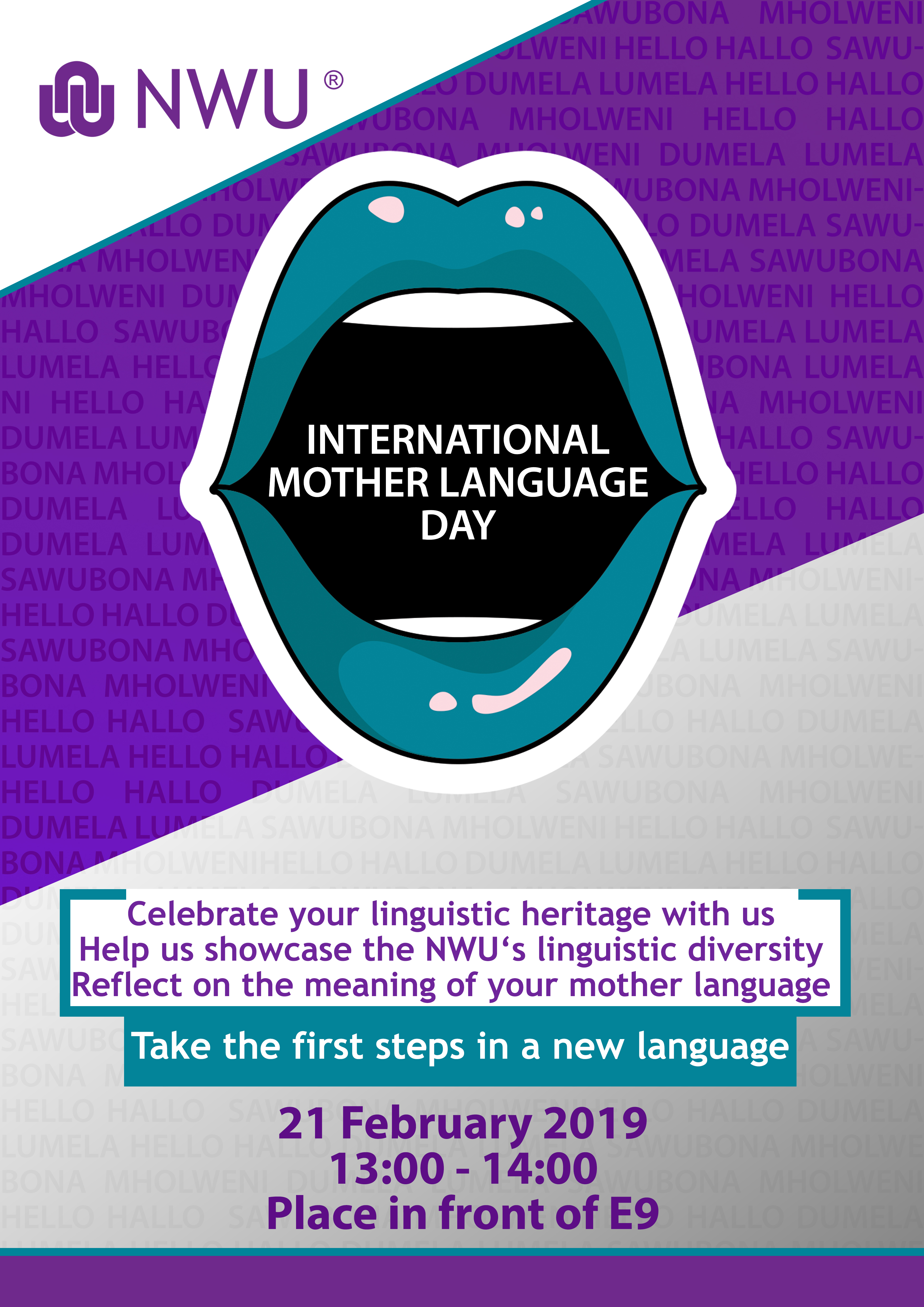 The School of Languages would like to invite you to celebrate International Mother Language Day with us on 21 February 2019 between 13:00 and 14:00. This will be essentially be a student-centred initiative, but staff members are very welcome to participate. The celebration will consist of 3 components.