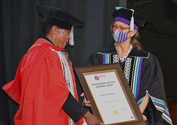 The NWU recently conferred an honorary degree upon Justice Bess Nkabinde. Handing over her certificate is Prof Sonia Swanepoel, deputy vice-chancellor for community engagement and Mahikeng Campus operations.